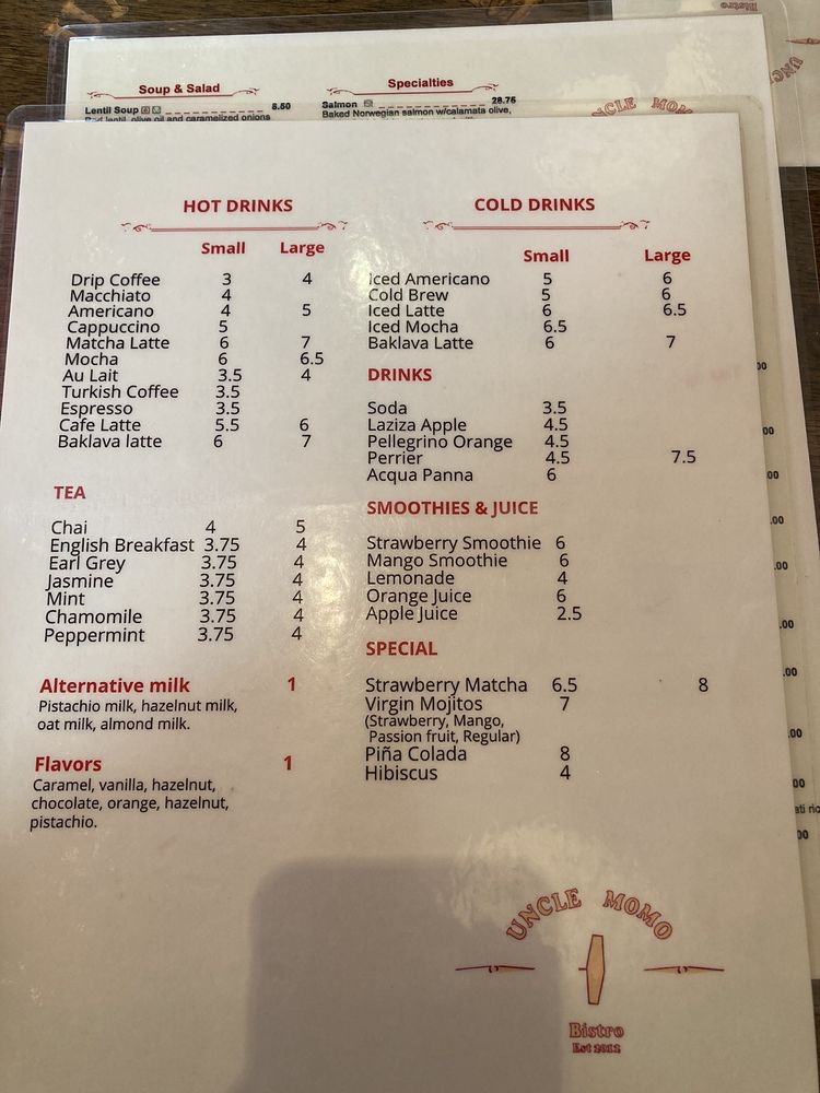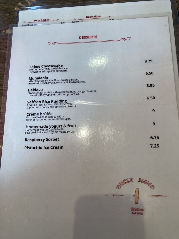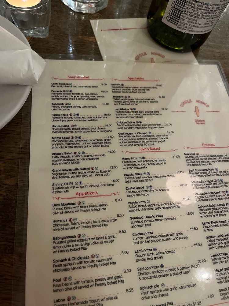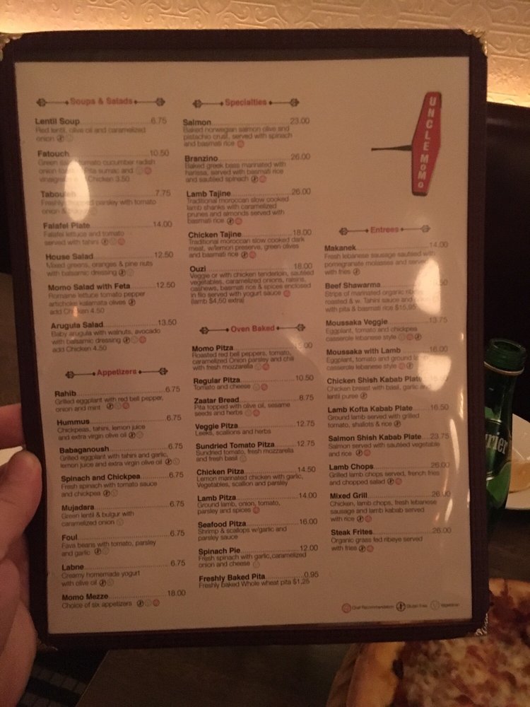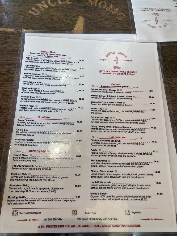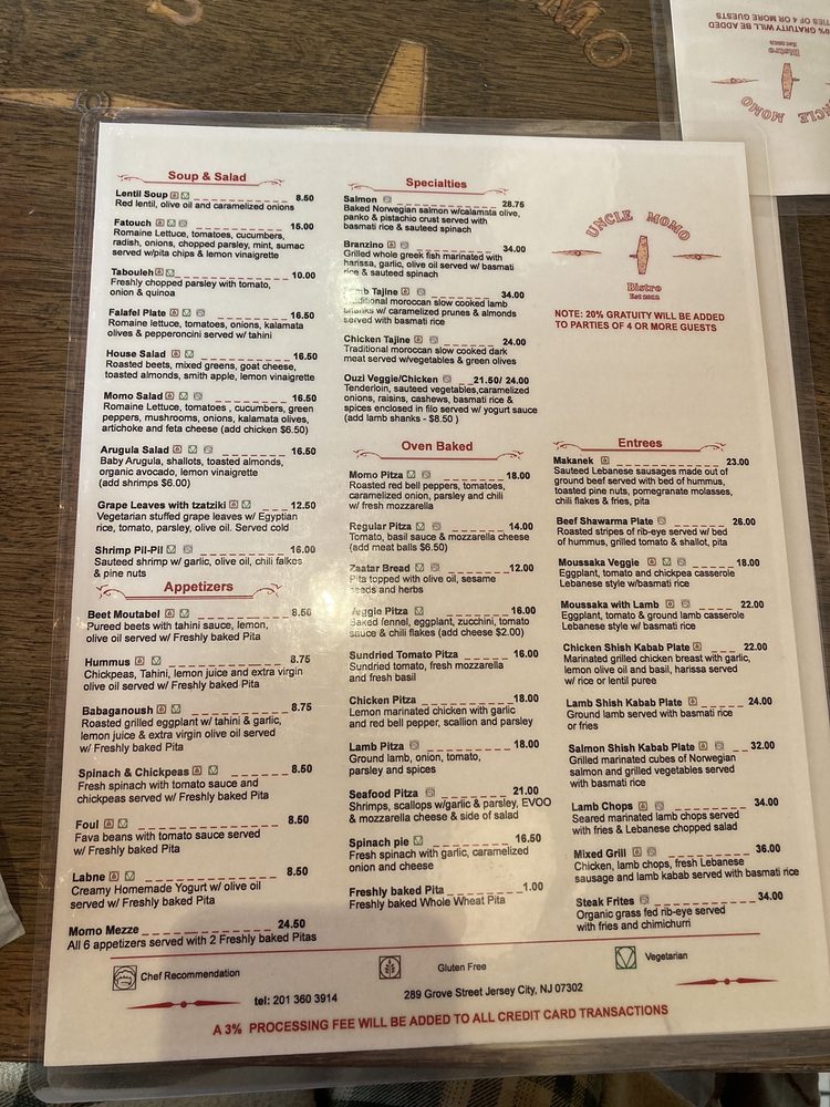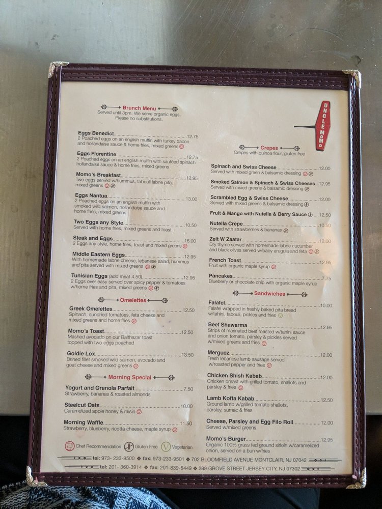 Introducing Uncle Momo, a charming French-Mediterranean restaurant located in Jersey City, NJ. Known for its friendly service and excellent food, Uncle Momo offers a diverse menu with Vegan and Vegetarian options. The Lentil Soup and Fatouch Salad are must-try dishes, showcasing fresh ingredients and bold flavors. Customers rave about the handmade pita and the warm hospitality experienced at Uncle Momo. The outdoor seating, live music, and BYO option add to the cozy ambiance of the restaurant. Whether you're looking for a delightful brunch, lunch, dinner, or dessert spot, Uncle Momo caters to all occasions. With exceptional service and delectable dishes like the Salmon Shish Kebab and Baklava Latte, Uncle Momo promises a memorable dining experience for all. Visit Uncle Momo for a taste of Mediterranean delight that will leave you wanting more.